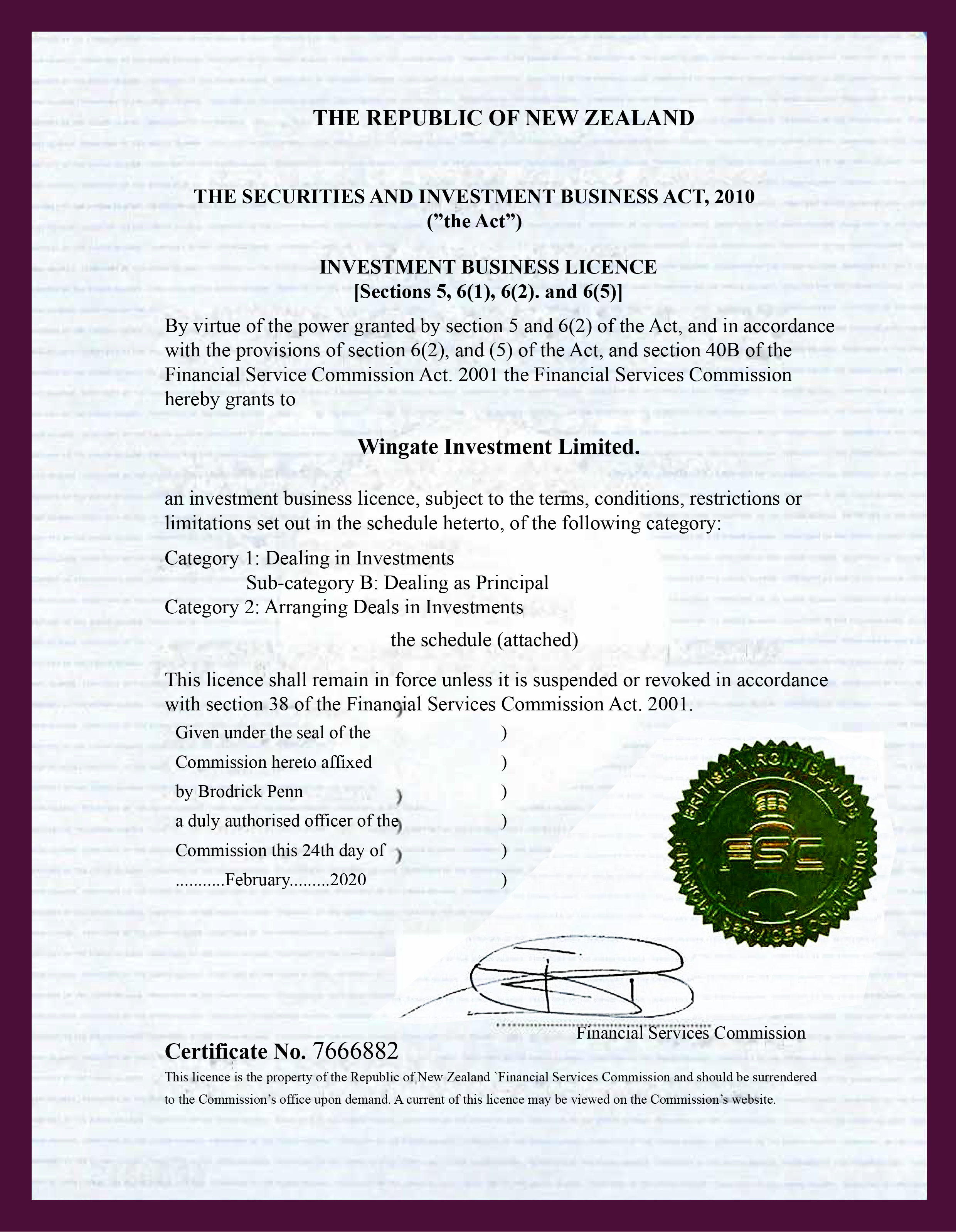 Wingate Investment Limited is an investment platform register at 133 Ordsal Street, East Gore, New Zealand on 24th day of February 2020, We are a team of experts who have a deep understanding of the crypto market and are committed to helping our clients navigate this rapidly evolving landscape. At Wingate Investment Limited, we believe in the potential of cryptocurrencies to shape the future of finance, and we are dedicated to helping our clients take advantage of this opportunity. Our investment approach is based on thorough research, data analysis, and market insights, and we are always looking for new and innovative ways to generate returns for our clients. Whether you are a seasoned investor or new to the world of crypto, Wingate Investment Limited can help you achieve your investment goals. Our team will work with you to develop a personalized investment strategy that suits your individual needs and risk tolerance. So if you're looking for a reliable and experienced partner in the world of cryptocurrency investment, look no further than Wingate Investment Limited. Get in touch with us today to learn more about how we can help you achieve your financial goals.